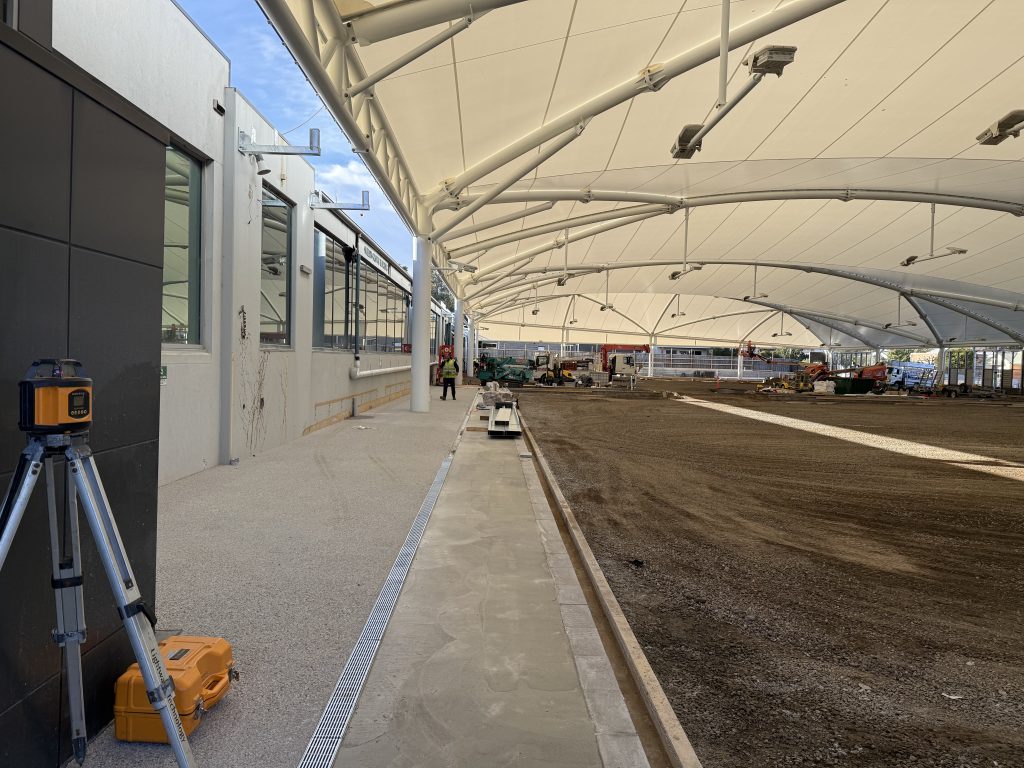 Visible progress continues across the site with recent works including the completion of the exposed aggregate concrete around the perimeter, and the installation of glazed panels and louvres bringing the architectural vision into full view.